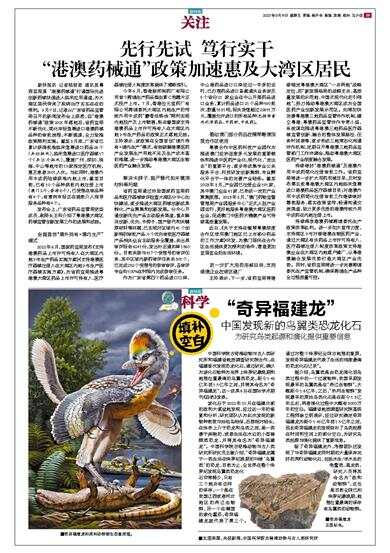 中国科学院古脊椎动物与古人类研究所和福建省地质调查研究院合作,在福建首次发现恐龙化石,通过研究,确认为该化石物种为世界上侏罗纪最晚期和地理位置最南的鸟翼类恐龙,距今1.48亿年到1.5亿年之间,并将其命名为“奇异福建龙”,这一成果6日在国际学术期刊《自然》发表。