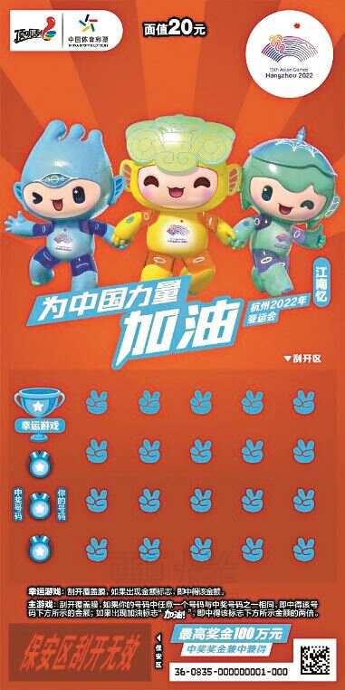 新快报讯 记者陆妍思 通讯员粤体彩报道 令人期待的杭州第19届亚运会将于9月23日开幕,体彩顶呱刮为您准备了“亚运专属搭子”——20元即开票“为中国力量加油 亚运会”,并携手亚运会吉祥物组合“江南忆”,一起用好运迎接亚运会的到来。