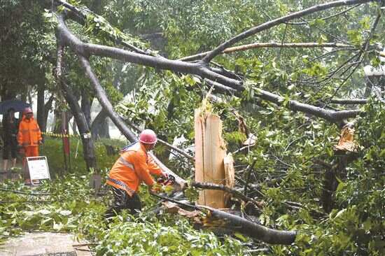 ■9月8日,深圳园林绿化工人冒雨清理倒伏的树木。新华社发