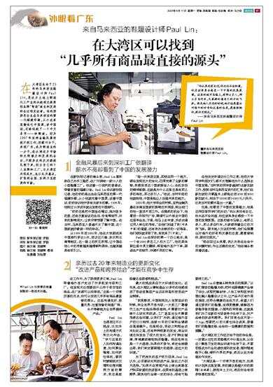 在大湾区生活了23年的马来西亚鞋履设计师Paul Lin,是这片土地上制造代工产业的兴起到无数原创品牌“智造”诞生和发展的全过程见证者。他的奶奶是出生在马来西亚的第一代福建华裔,从小在家里教他吃中国菜,讲中国话,还给他起了一个中文名字——林顺凌。因为1997年亚洲金融风暴而找不到工作,因缘巧合下,来到广东,成为制造业的一分子,在认清这片市场的无限潜力和发展机会后,不顾亲友的反对毅然扎根下来,创立自己的个人品牌和工厂,与大湾区共同成长,也以此为基点,扩张到全国、亚洲乃至欧美的市场。