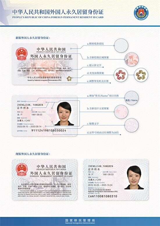 新版永居证在保持现版基本式样的基础上,新加入了体现国家标识的五星元素,优化美化版式布局,采用更为先进的防伪技术,改进提升了证件信息存储和应用管理服务手段。新版永居证升级技术、增强功能,新证启用后,持证人可通过互联网平台线上办理交通出行、生活消费等私人事务,将进一步便利持证人在境内工作、学习、生活。
