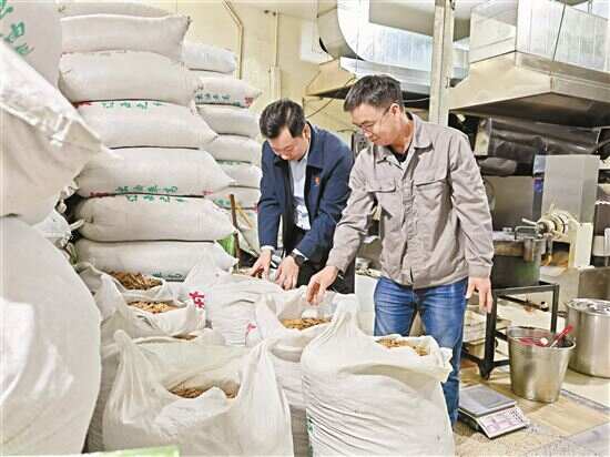 ■驻岭门镇工作队队长黄灶涛和企业负责人查看花生油粕。