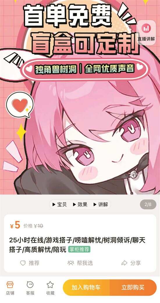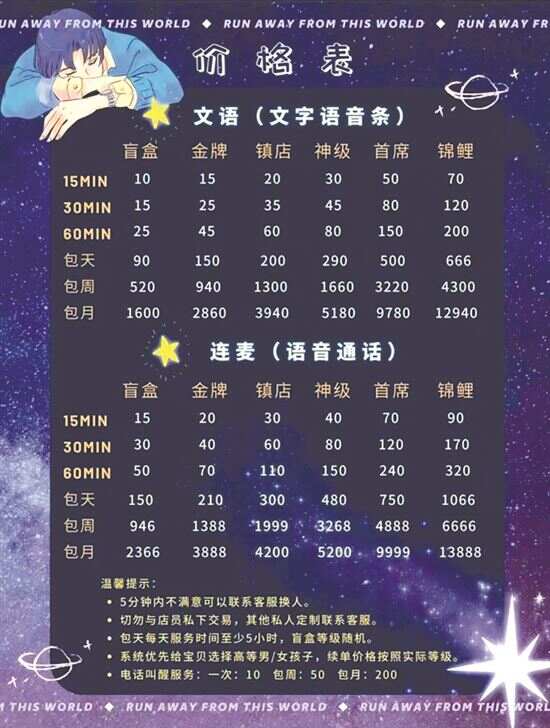 新快报记者实测发现,部分店铺存在低价吸引用户购买的情况,例如在“独角兽树洞”店铺内,首页宣称“首单免费”,下面所有树洞服务标价为5元,联系客服后得知至少付10元才能获得相关服务,且最低价的服务被标记为“盲盒”,遇到什么样的“开导员”完全拼运气。在定价模式上,不同店铺在同一种类服务存在价格悬殊的情况。以陪聊天“包天”服务为例,店铺“独角兽树洞”的“文语”方式最高收费666元,“连麦”方式最高收费1066元,另一家店铺“大哥你好呀”的“文语”方式最高收费480元,“连麦”方式最高收费770元。