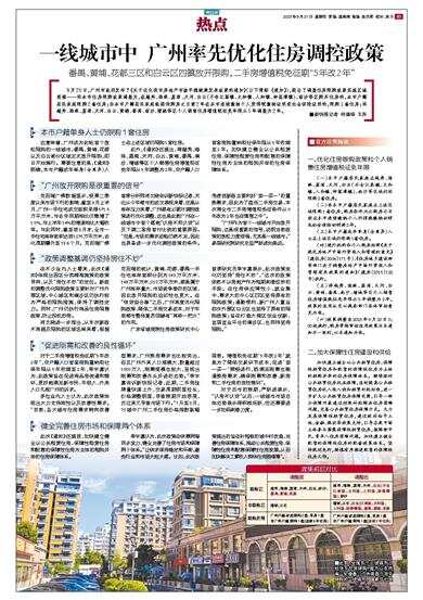 9月20日,广州市政府发布了《关于优化我市房地产市场平稳健康发展政策的通知》(以下简称 《通知》),提出了调整住房限购政策实施区域范围——将本市住房限购政策调整为,在越秀、海珠、荔湾、天河、白云(不含江高镇、太和镇、人和镇、钟落潭镇)、南沙等区购买住房的,本市户籍居民家庭限购2套住房;非本市户籍居民家庭能提供购房之日前2年在本市连续缴纳个人所得税缴纳证明或社会保险证明的,限购1套住房;将越秀、海珠、荔湾、天河、白云、黄埔、番禺、南沙、增城等区个人销售住房增值税征免年限从5年调整为2年。
