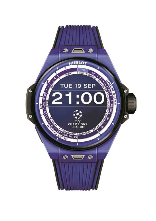 HUBLOT宇舶表日前发布全新限量版第三代Big Bang e欧洲冠军联赛智能腕表。腕表采用44毫米蓝色陶瓷表壳,配备八种不同传感器。距比赛正式开始前15分钟,腕表的欧洲冠军联赛表盘将进入倒计时,显示对阵双方球队的球员阵容。比赛开始后,智能腕表将自动切换至“比赛模式”,全程追踪比赛实况,旋转表冠则可切换至“重播”模式。