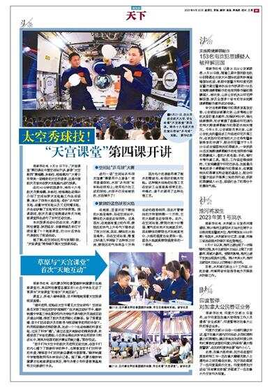 据新华社电 9月21日下午,“天宫课堂”第四课在中国空间站开讲,新晋“太空教师”景海鹏、朱杨柱、桂海潮为广大青少年带来一场精彩的太空科普课,这是中国航天员首次在梦天实验舱内进行授课。