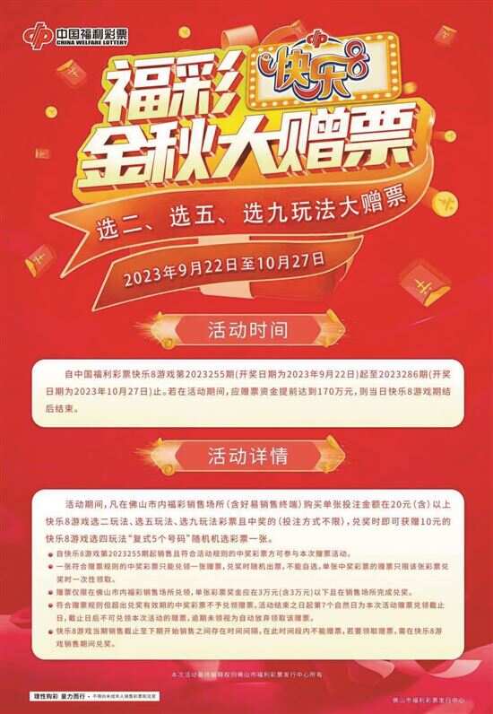 新快报讯 记者陆妍思 通讯员袁苏华报道 为回馈广大购彩者对中国福利彩票快乐8游戏的支持与厚爱,佛山市福利彩票发行中心于2023年9月22日起在全市范围内开展“福彩快乐8 金秋大赠票”营销活动,3种指定玩法中奖可获10元赠票,共将送出170万元赠票。