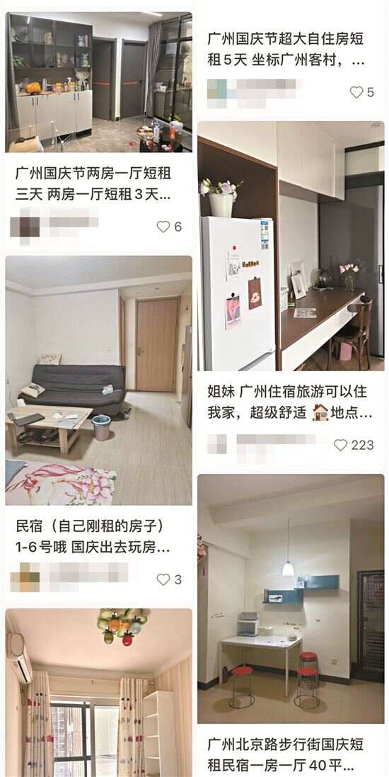 同样,国庆假期准备宅在家里的黄女士也打算把自住的两房一厅中其中一间拿出来短租。“希望招募到想在广州玩,但又对高昂酒店价格有所顾虑的朋友。”她还放出了自家房间的图片、能出租的时间以及自家小区的名字,明确只要爱干净的女生,不能乱翻东西,需要自己准备一次性洗漱用品和床单。