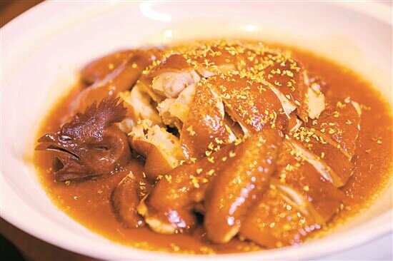 这是一道源于顺德三杯鸡做法的升华版菜式,改变了传统豉油鸡烹调过程中的猛火烹制状态,改用低温慢火浸的方式,让鸡肉更好地入味同时也不会因猛火攻而致口感柴。