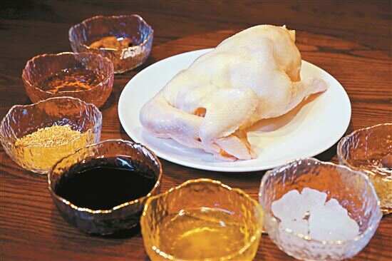 将备好的光鸡浸入事先做好的豉油水中三起三落,以让鸡内外温度一致从而受热更均匀;