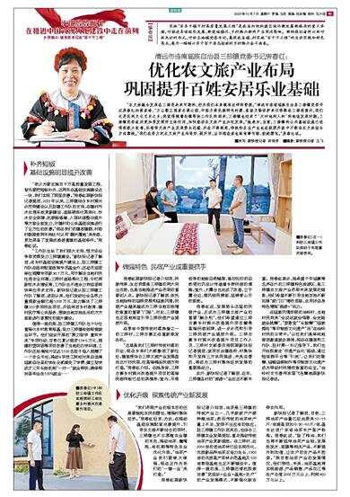 “农文旅融合发展在三排是未来可期的,因为我们本身就有这样的资源。”清远市连南瑶族自治县三排镇党委书记房春红如数家珍:“万山朝王国家石漠公园、中国少数民族特色村寨、省级文物保护单位等都在三排范围内,我们还是民间文化艺术之乡;我觉得随着驻镇帮扶工作队的到来,三排镇也迎来了‘天时地利人和’的绝佳发展时期,三排镇党委政府更加要发挥好主体作用,加快推动农文旅产业兴旺发展。”她表示,当前,三排镇的公共基础设施已经得到极大改善,民宿等文旅产业发展势头迅猛、并在不断规范,传统的农业产业也在提质升级中不断向农文旅结合方向靠拢。“我们在努力把农文旅产业布局好、提升好,让百姓在家也能有事可做、鼓起腰包。”房春红说。