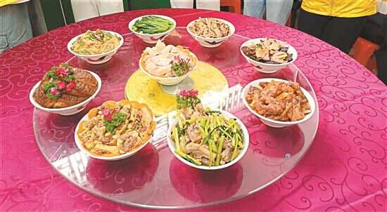新快报记者了解到,增城派潭客家地区的九大簋与别的地方不一样。它由白切鸡、芹菜蒜焖鹅、香芋扣肉、酿豆腐、炸香脆酥鱼、粉丝鸡杂、洋葱木耳炒鱿鱼、碎扣焖竹笋、蒜蓉油菜九道菜组成,食材多为当地农家生产的禽畜、蔬菜、粮食等,通过炒、炸、蒸、浸、焖、煮等多种烹饪手法制作而成。只要有人摆上九大簋,必定是数十人、上百人聚在院子里或围屋中,围坐在八仙桌旁品尝美食。