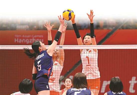 ■10月7日,中国队球员袁心玥(上右)在比赛中拦网。当日,在杭州亚运会女子排球决赛中,中国队以3比0战胜日本队,以六战全胜卫冕亚运会冠军。这也是中国女排历史上第九次摘得亚运金牌。新华社发