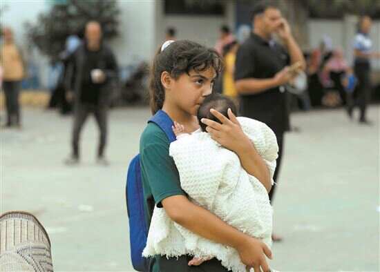 ■10月9日,巴勒斯坦人在加沙地带南部 城市汗尤尼斯的一所学校躲避以色列空袭。