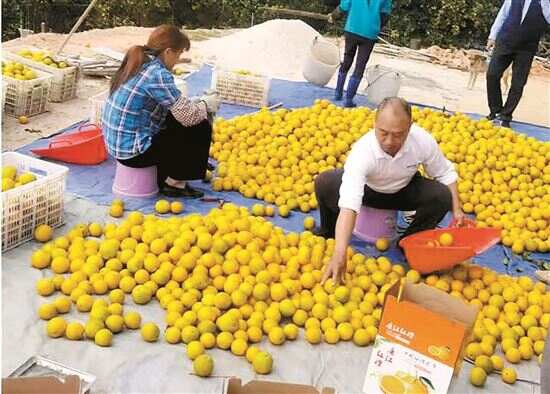 ■李景能协助农户把刚摘下来的红橙挑拣、打包装后销往广州市白云区。