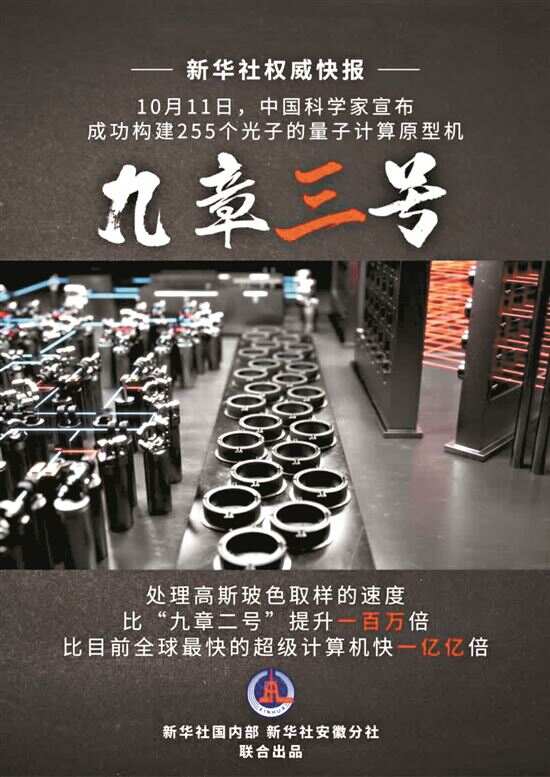 中国科学技术大学11日公布消息称,255个光子的“九章三号”量子计算原型机由该校潘建伟、陆朝阳等组成的研究团队与中国科学院上海微系统与信息技术研究所、国家并行计算机工程技术研究中心合作构建。当天,国际知名学术期刊《物理评论快报》也发表了这一科研成果。