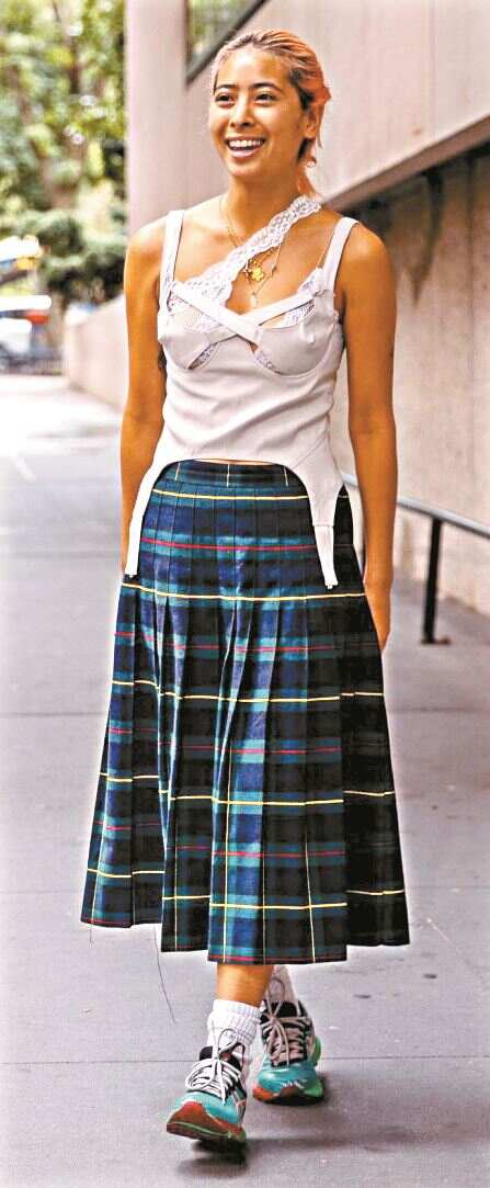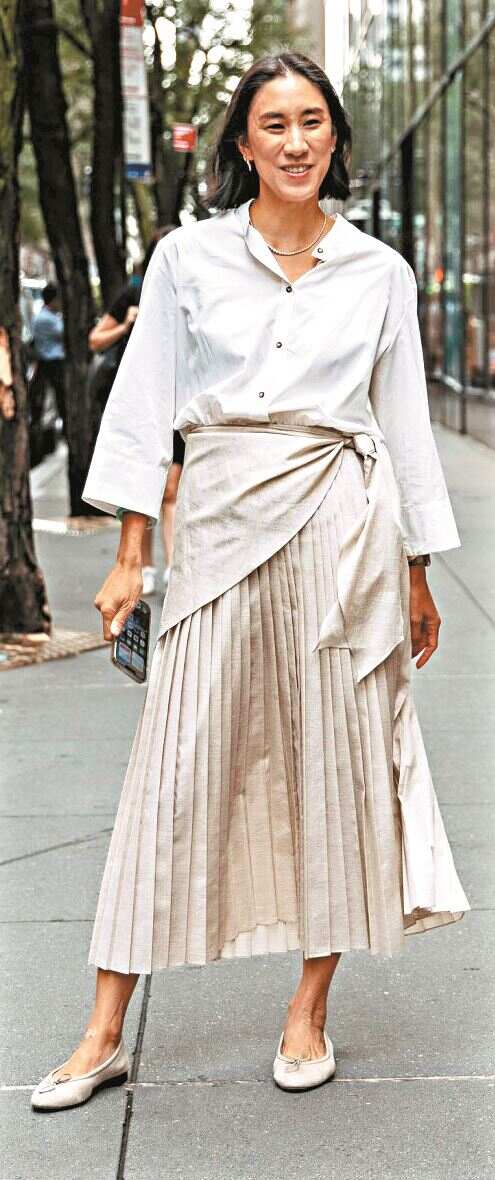 中长款的百褶裙因为量感比较足,建议上衣下摆扭开几颗扣子穿,或者选择有弧度的上衣,提高腰线的同时增加造型感。