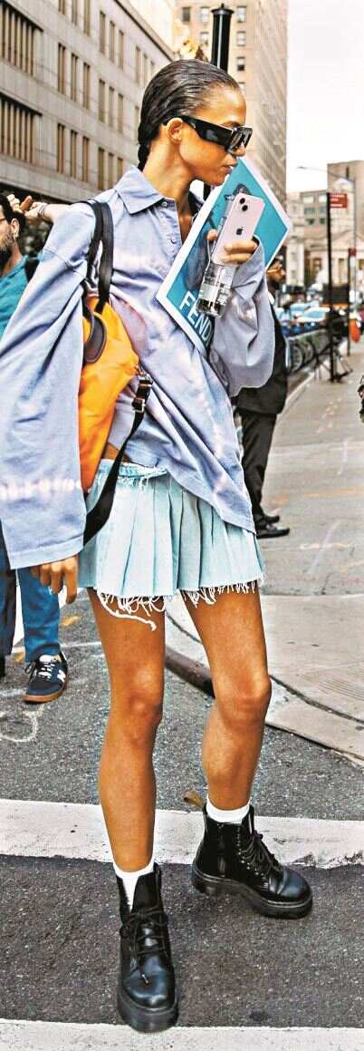 搭配迷你牛仔百褶裙可尝试跳出“安全区”,去搭配看似“不太好驾驭”的单品。