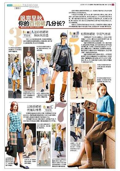 今季流行的百褶裙,裙子长短、褶子宽窄的款式都有,风格上略有差别:迷你裙款走辣妹路线,短款显青春活力,中长款则体现知性优雅。褶子越多越显风格活泼,如果褶子宽度较窄且多,运动感会比较强;褶子宽度在3到5厘米左右更偏学院风;褶子较少的款式简洁大方,适合通勤搭配。