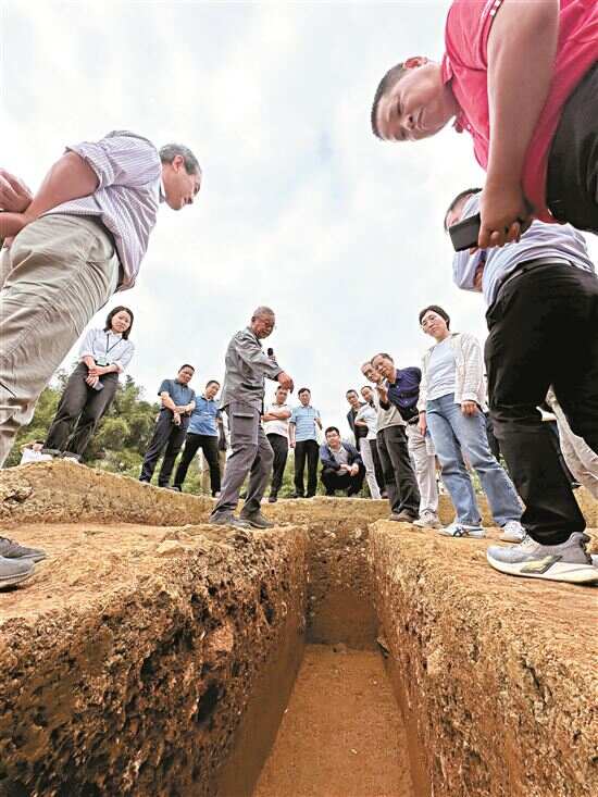■来自全国各地的考古专家学者围绕岩山寨正在考古挖掘的探方进行讨论,梁志钦摄