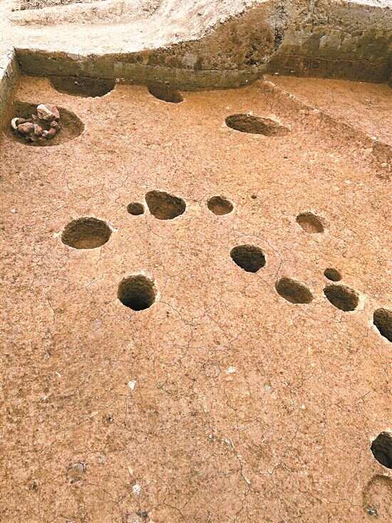 金志伟还介绍,去年还发现有两例口径约50厘米大,填充着烧土碎块的圆坑,今年也发现了3例,目前推断这些圆坑有可能当时是放柱子用的,而为了防止柱子下沉,底下就垫这些烧土碎块,形成柱础的作用。
