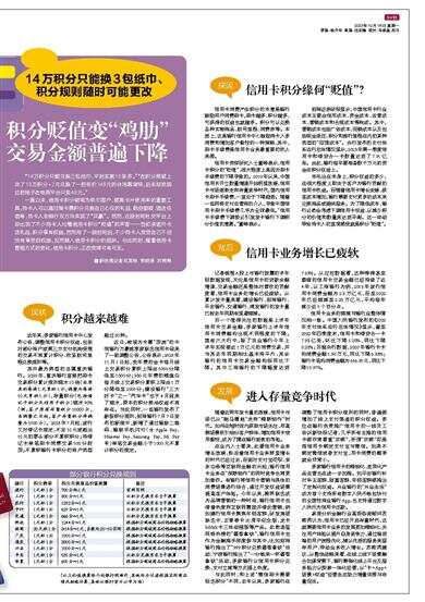 信用卡资深研究人士董峥表示,信用卡积分的“贬值”,很大程度上是因为刷卡手续费的下降导致的。2019年以来,中国信用卡开立数量增速开始明显放缓,信用卡市场逐渐走向存量竞争时代,国内信用卡刷卡手续费,一直处于下降趋势。随着一些网络支付运营商的介入,导致中国信用卡刷卡手续费几乎为全球最低。“信用卡手续费下调势必引发发卡银行下调积分价值的意愿。”董峥表示。