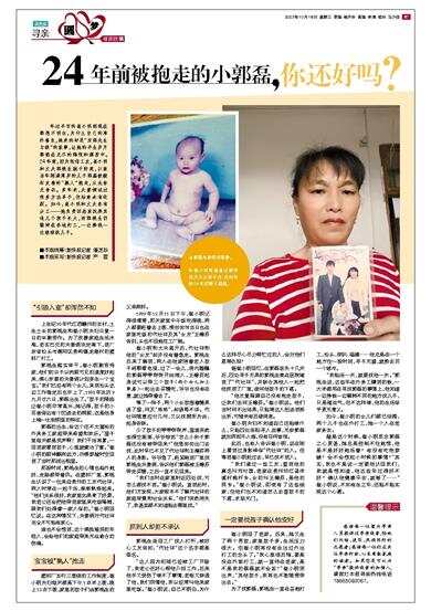 年过半百的崔小明到现在都想不明白,为什么自己的淳朴善良,换来的却是“东郭先生与狼”的故事,让她的半生岁月都陷在无尽的悔恨和痛苦中。24年前,因为轻信工友,崔小明和丈夫郭桃生疏于防范,以致当年刚满周岁的儿子郭磊被貌似友善的“熟人”抱走,从此杳无音讯。多年来,夫妻俩试过很多方法寻子,但始终未有收获。如今,崔小明和丈夫各有分工——她负责回老家抚养其他几个孩子长大,而郭桃生仍辗转在各地打工,一边挣钱一边继续找儿子。