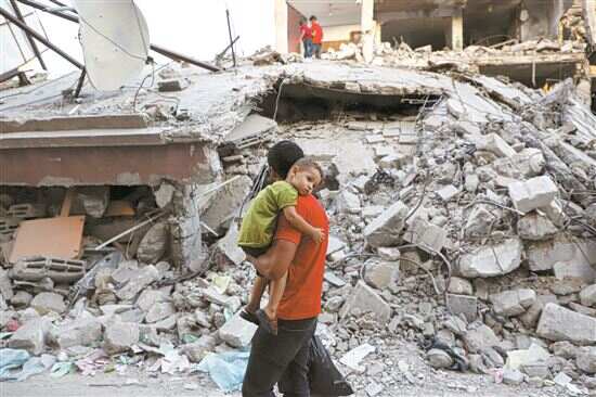■10月16日,在加沙地带南部城市汗尤尼斯,人们从遭以色列空袭损毁的建筑废墟前走过。 新华社发