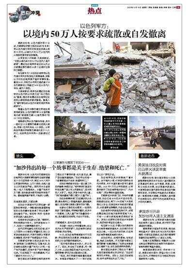 在代尔拜拉赫往北的加沙城,成千上万居民13日接到以军警告后,担心以军发动地面进攻,不得不按照以军要求往南撤离,把许多尸体遗留在太平间。