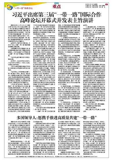联合国秘书长古特雷斯说,没有基础设施就没有发展。广大发展中国家目前仍有数十亿人缺乏基础设施,这是本届“一带一路”国际合作高峰论坛以及共建“一带一路”倡议的重要性所在。他表示,在共建“一带一路”倡议推动下,各国在基础设施领域获得更多机遇,加速落实可持续发展目标,“这为数十亿民众以及我们共享的地球带来希望和进步”。他还高度赞赏各方建设“绿色丝绸之路”的努力,并表示联合国将继续提供支持。