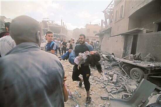 ■10月17日,在加沙地带南部城市拉法,一名男子转移伤者。 新华社发