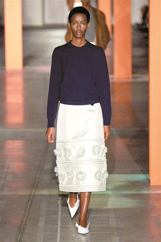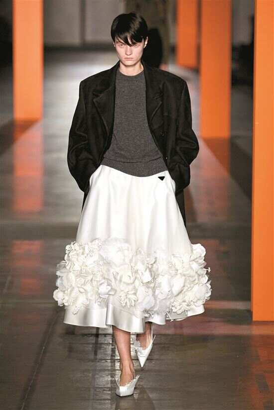 ■Prada将缀满立体花朵的裙摆与基础款衣衫结合,为日常穿搭演绎现实灵感(Prada 2023秋冬系列)。