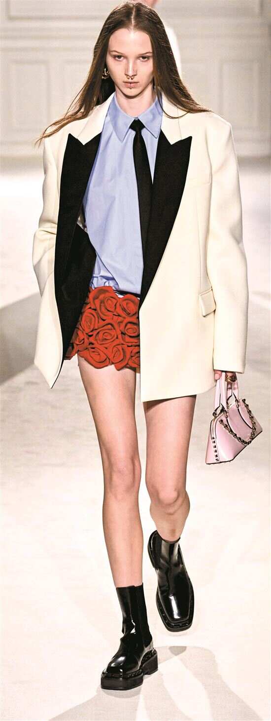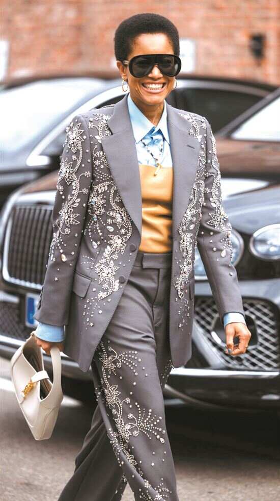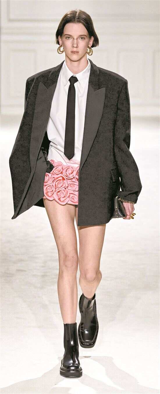 在中性搭配中加入花朵、蕾丝、粗花呢、重工钉珠等浪漫元素的单品,亦可平衡造型穿搭的硬朗与柔美。