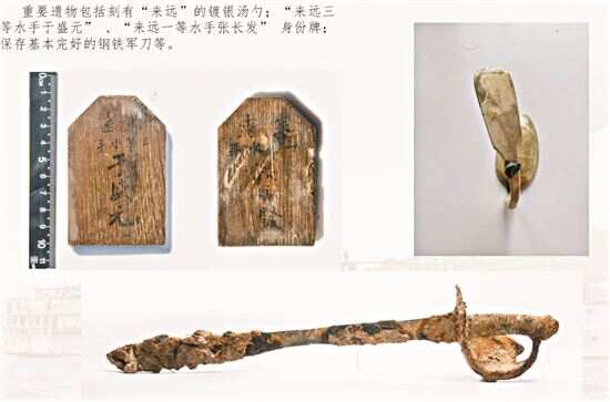 2017年以来,在威海湾原北洋海军基地附近,通过水下考古调查结合造船档案和战争档案等研究,陆续发现定远、靖远、来远三舰,出水刻有“来远”舰名的银勺和写有“来远”水手姓名的身份木牌,以及大量武器弹药、生活用品等。其中,定远舰于艏部主炮区发现并成功提取整块重达18.7吨的防护铁甲板。
