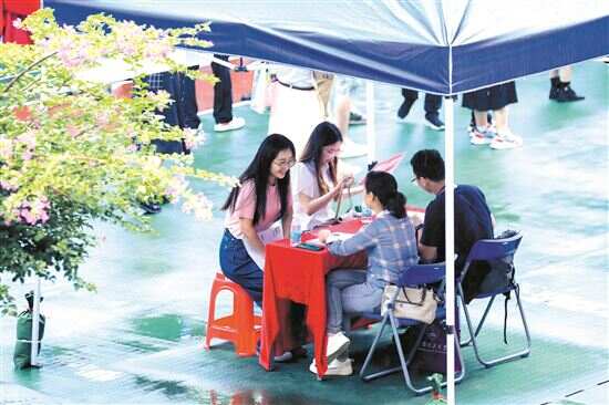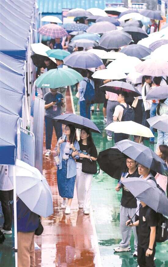 “同学,你哪个专业的,工作意向是什么?”即使是下雨天,现场求职毕业生和招聘企业的热情都丝毫未减。企业招聘人员冒雨早早到场,将现场招聘面试进行得热火朝天。求职者稀少的摊位前,工作人员直接撑伞等在路边,向过路学生主动抛出“橄榄枝”,邀请学生到摊位进行沟通与面试。
