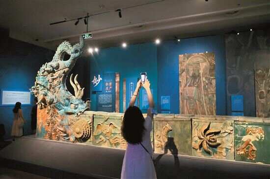 记者现场看到,远道而来的“三清殿琉璃正脊脊身及东西鸱吻”,以其硕大身姿和繁炫色彩,横亘展厅中央,震撼非常,让人充分体会到建筑的庄严,以及元代山西琉璃工艺的卓越成就。