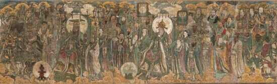 《朝元图》壁画,位于永乐宫主殿三清殿,殿内正中神龛原本供奉道教最高神祇元始天尊(玉清)、灵宝天尊(上清)和道德天尊(太清)的塑像。围绕三清神像绘制有一铺壁画,高达4.26米,全长94.68米,总面积403.34平方米。它采用中国传统工笔重彩勾填画法,表现了以六帝二后八位主神率领近二百九十位神仙朝拜三清的浩大场面。
