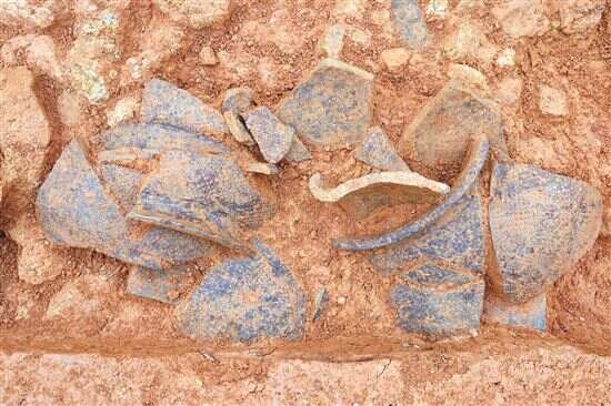 ■遗址现场出土的陶釜碎片。 新快报记者李小萌摄