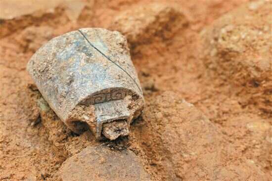 记者看到,如今棺椁无存,墓底空余许多巴掌大石子,上有5件遗物:盈盈可握一铜铙、青铜碎片、淡白如玉陶杯、褐色陶碗,还有一件似被人为打碎的深灰色“陶釜”,广州市文物考古研究院调查勘探部助理馆员谷俊杰解释,“也可理解为陶罐,上有方格纹”。