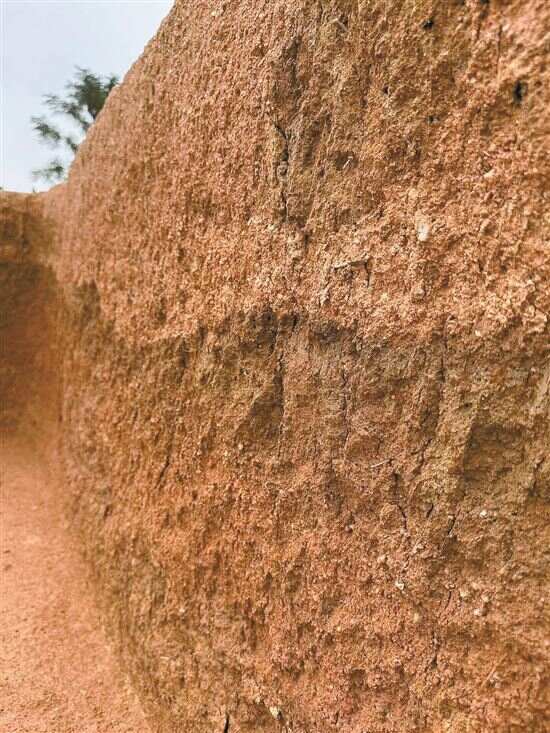 古物保持着出土时角度;抬眼望去,一条斜坡墓道延展;垂望四周,有深约半米围沟,将大墓环抱其中。还有些柱洞,柱洞与墓室之间揭露的地面上,一个红陶罐碎裂大半。“柱洞、陶罐等,或显示当时这里存在‘墓祭’地面建筑。”谷俊杰说。