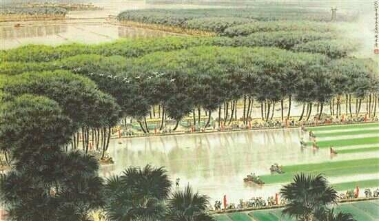 他的《春闹葵乡》描述了春耕时分,农民们驾着新买的插秧机,在村民欢快围观的情况下,正忙着插秧。沿着曲折有致的田埂种植起来的葵树,已经密茂成林,使画面呈现出生机勃勃而又无限美好的景象。