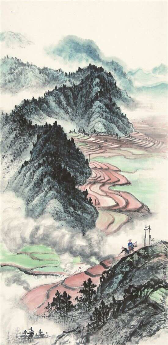 ■《东风吹遍瑶家寨,绿满梯田青满山》,纸本设色,148×73cm,1963年。