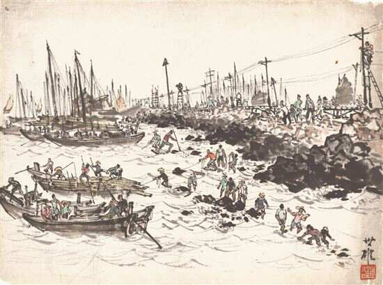 ▲《湛江堵海工程工地速写01》,纸本设色,32×44.6cm,1960年。