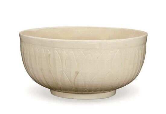 另一瞩目之作是金代定窑刻莲瓣鱼藻纹大盌。这种花式深腹钵状大盌,或为酒具中温酒之用。尺寸大如本拍品的定窑大盌数量稀少,因为对陶匠或窑师而言,其烧造难度相当大。