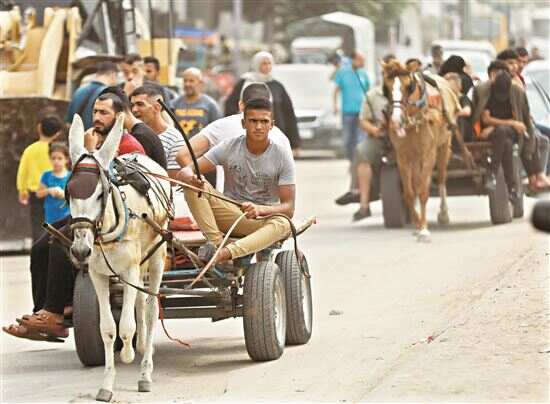 ■因缺乏燃料,加沙地带南部城市汗尤尼斯的人们用驴车出行。新华社发