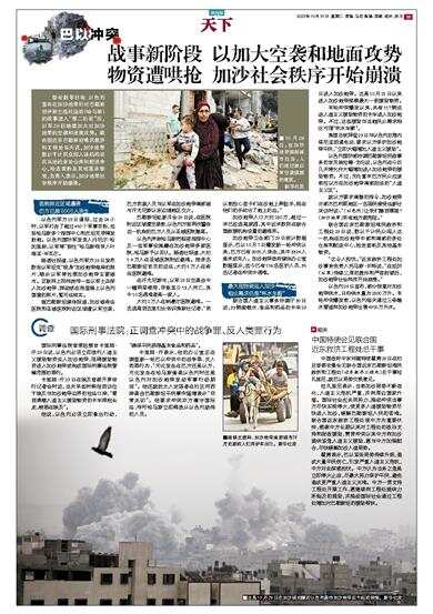 综合新华社电 以色列宣布在加沙地带针对巴勒斯坦伊斯兰抵抗运动(哈马斯)的战事进入“第二阶段”后,以军29日继续加大对加沙地带的空袭和地面攻势。联合国近东巴勒斯坦难民救济和工程处当天说,加沙地带数以千计民众闯入该机构设在当地的多处仓库和配送中心,抢走面粉及其他基本物资,负责人表示,加沙地带社会秩序开始崩溃。