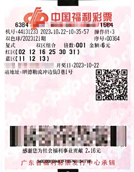 当晚,福利彩票双色球第23121期开奖中,当期全国共中出8注780万多元一等奖,其中1注花落佛山顺德区勒流街道44131233福彩销售站点,中奖彩票是一张投注金额为6元的“6+3”复式票,共中出1注一等奖,2注二等奖,奖金合计833万多元。这是继10月15日佛山幸运购彩者中出快乐8游戏508万元大奖后,佛山再次中出福彩大奖。