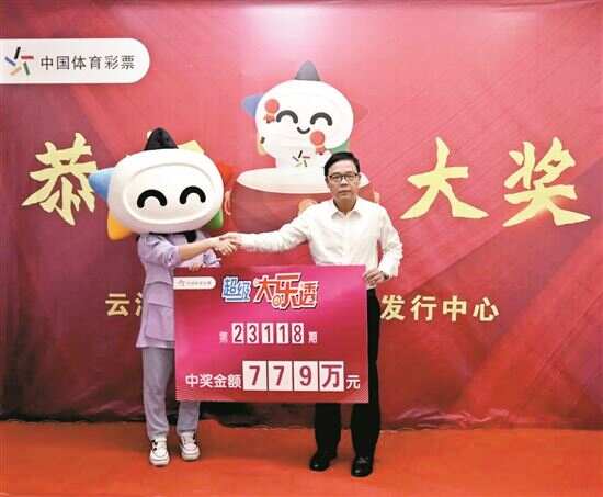 新快报讯 记者陆妍思 通讯员邓扬俊报道 体彩大乐透第23118期开奖中,云浮市郁南县连滩镇4421061877体彩实体店一张机选的20元10注“长票”中出779万多元一等奖。近日,幸运儿赵小姐(化姓)在家人的陪同下,现身云浮市体彩中心兑奖,为云浮市贡献税收155万元。云浮市文化广电旅游体育局党组书记、局长黄小涧为中奖者颁奖。