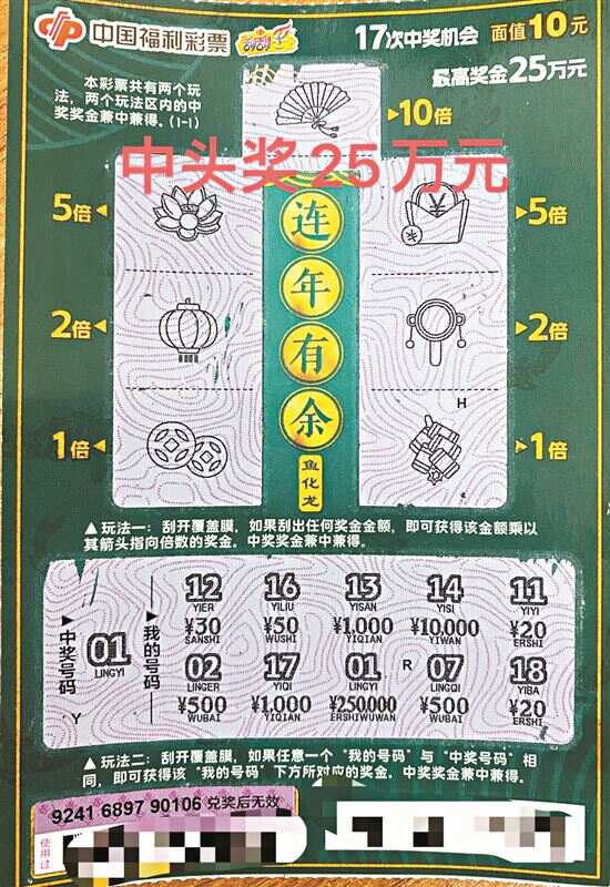 中奖当天,杨先生准备和女朋友到商场吃饭,经过一家福彩站点时,看着时间还早,就提议先进去买上几张“刮刮乐”玩玩。进店之后,他选择了新上市的面值10元的“连年有余”刮刮乐即开票进行刮彩。杨先生刮出第一张没中,带着失望刮了第二张,打算再不中就去吃饭,没想到刮开后,“‘我的号码’‘01’与其中一个‘中奖号码’一样,再看下面的奖金有好几个‘0’,数了数,中25万元”。他开心地交给销售员兑奖。销售员拿到彩票跟杨先生说:“恭喜你,中了一等奖25万元!”杨先生拿着中奖票反复数了好几遍,才确定自己真的中出了25万元。