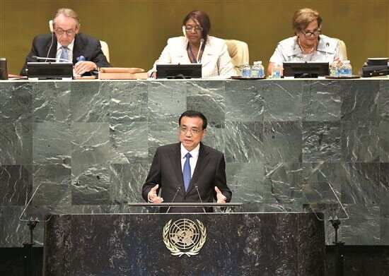 ■2016年9月21日,李克强同志在纽约联合国总部出席第71届联合国大会以“可持续发展目标:共同努力改造我们的世界”为主题的一般性辩论并发表题为《携手建设和平稳定可持续发展的世界》的讲话。新华社发